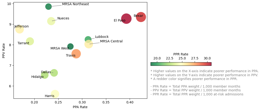Since differences in bubble size can be challenging to distinguish, bubble color was added to enhance clarity. Higher values across these metrics indicate poorer outcomes, with redder bubbles signifying higher PPR rates.